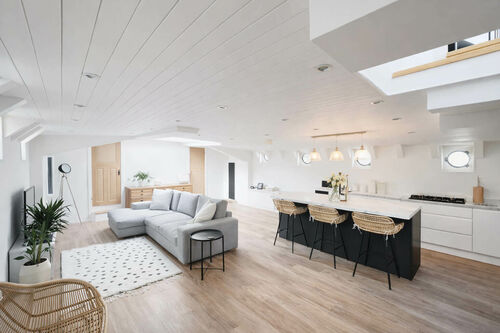 A staircase leads down to the stunning open-plan living area, beautifully finished throughout using high-quality materials.