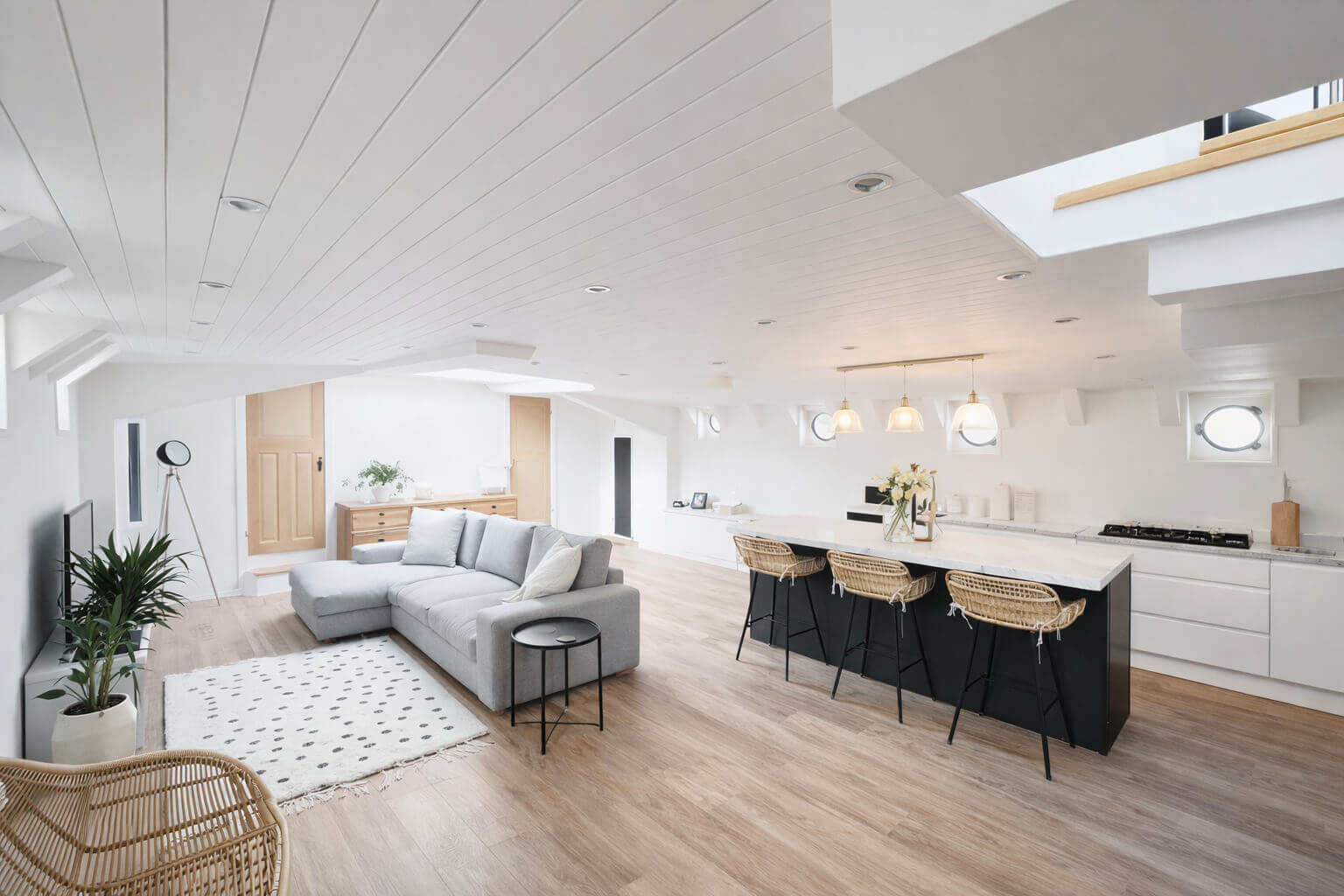 The lounge is light and inviting, benefiting from both portholes and a large skylight, creating a bright and airy atmosphere.