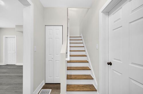 Upstairs, you’ll find two spacious bedrooms featuring beautiful hardwood floors, ample closet space, updated railings, and classic wood stairs that add warmth and character. A tastefully renovated full bathroom completes the upper level, offering both style and functionality.