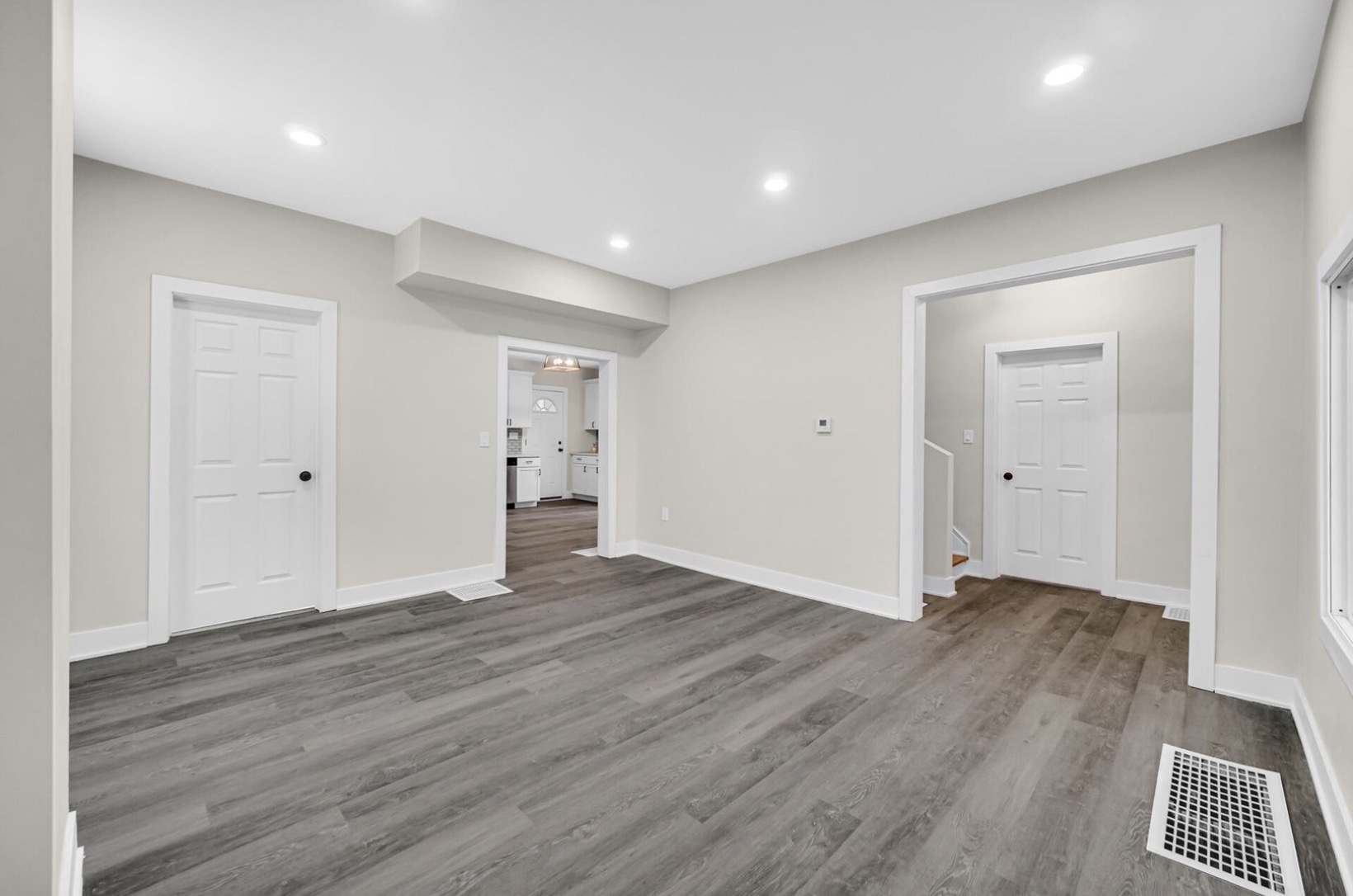 The main level features a bright and inviting living room complete with recessed lighting, updated flooring, and a large picture window that fills the space with natural light. The modern kitchen is thoughtfully designed with granite countertops, abundant cabinetry, and newer stainless steel appliances, making it ideal for both daily living and entertaining.
