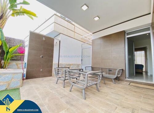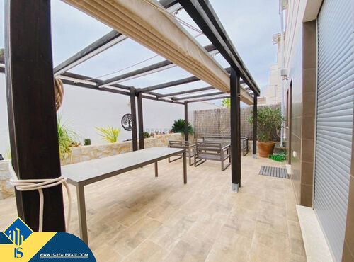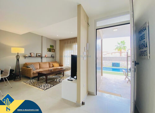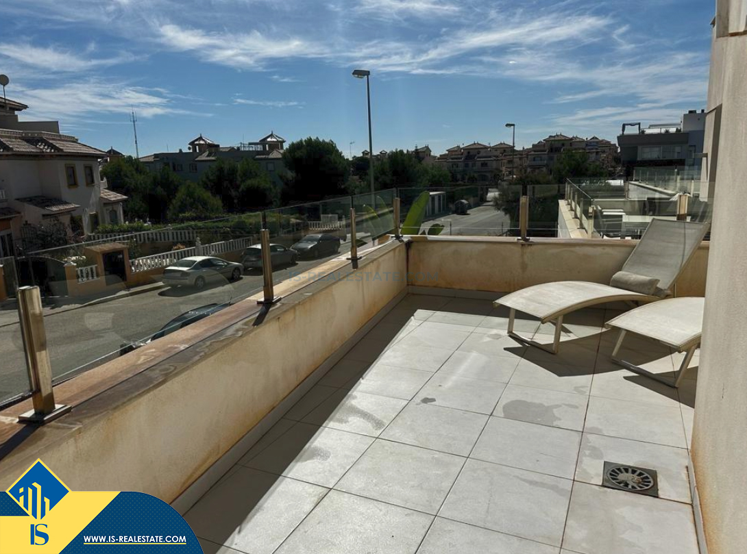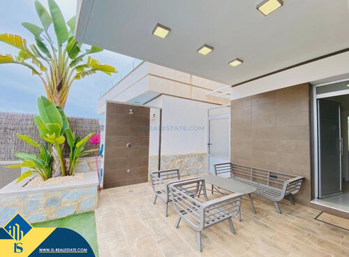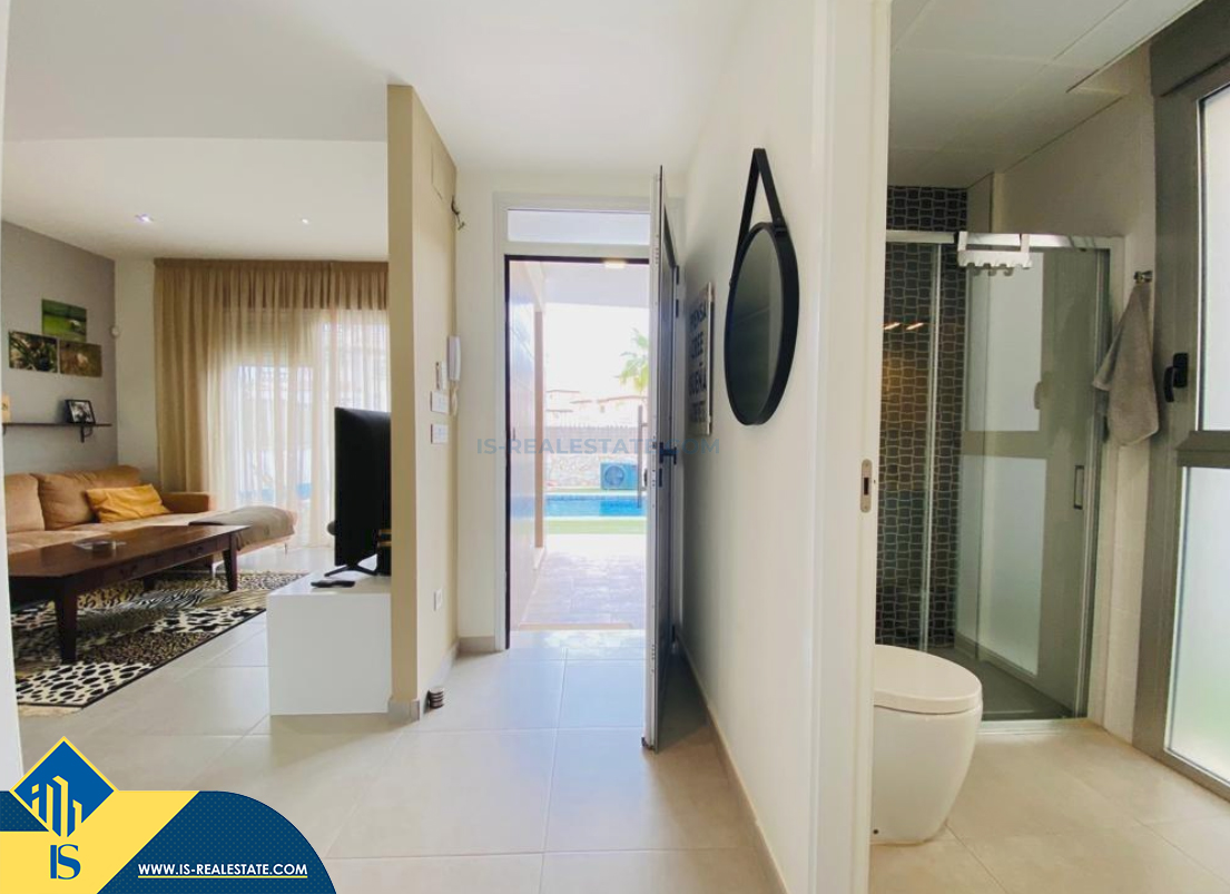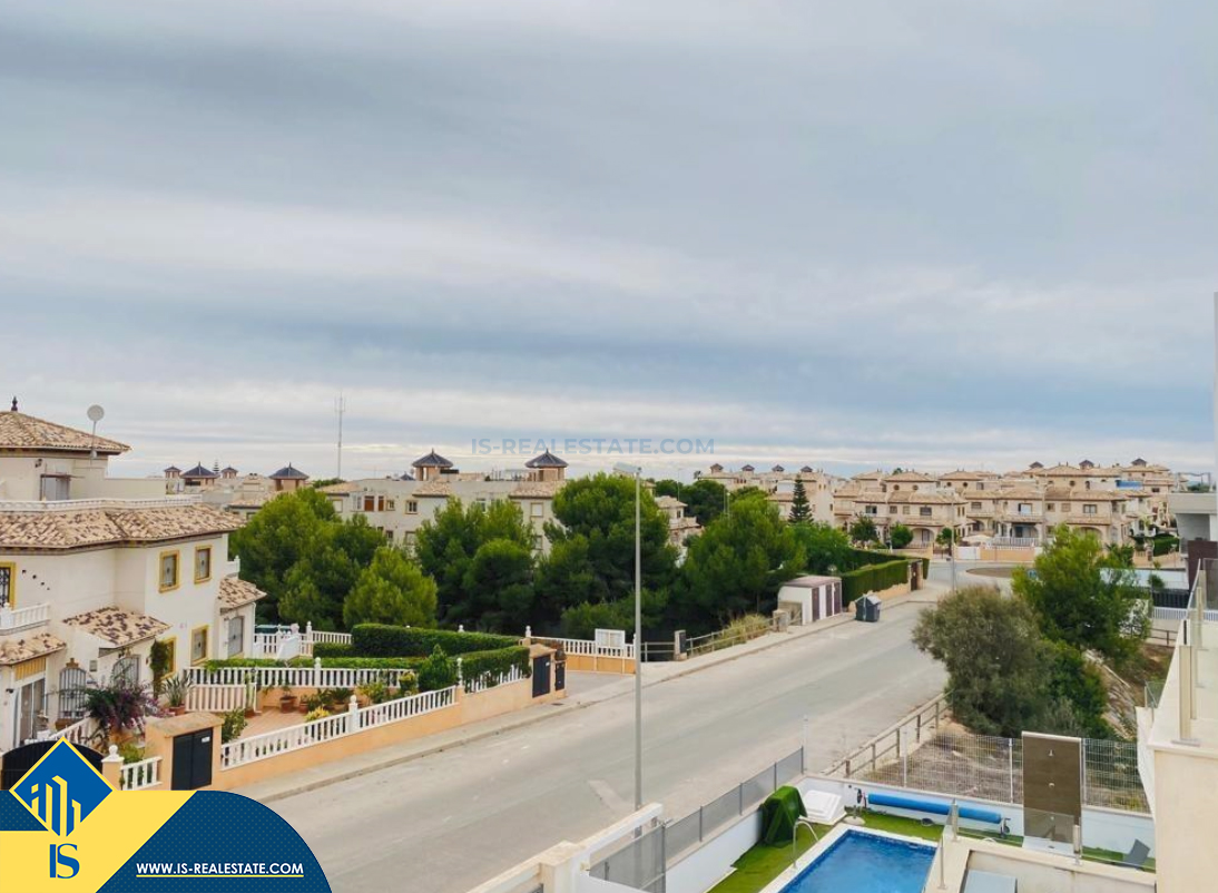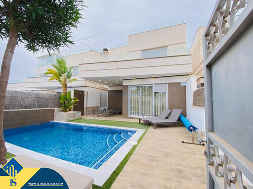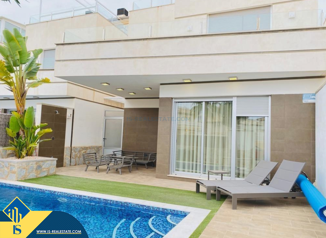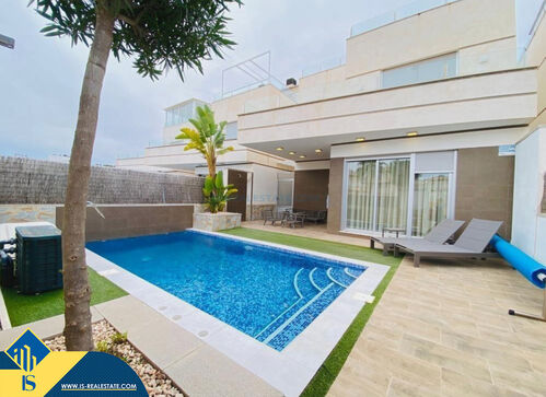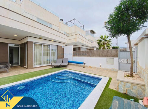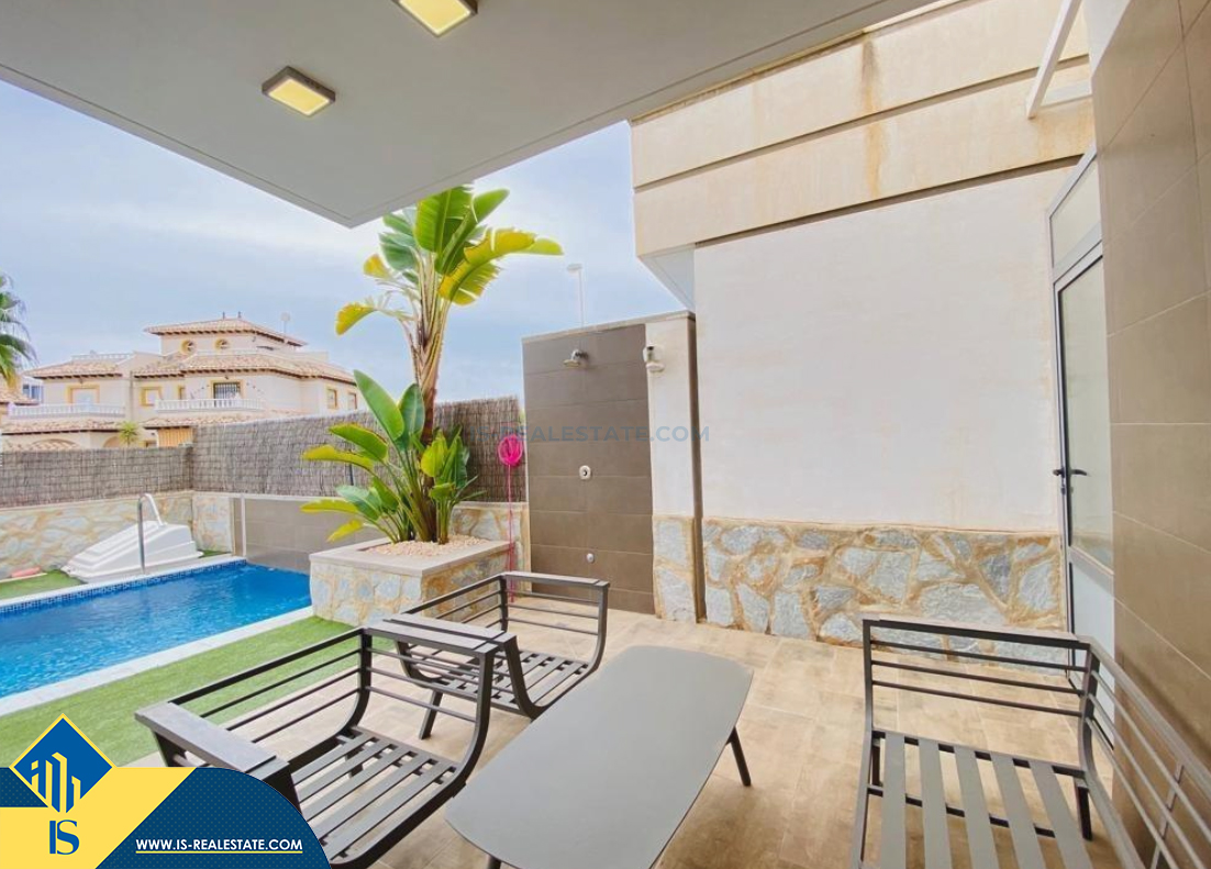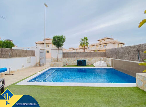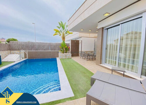 4-room villa of 2016 construction, in the province of Alicante, Orihuela Costa, Spain, 2.2 kilometres to the sea, total surface of 257 m², 54 kilometres to Alicante airport. The property has a courtyard, private swimming pool, parking space for a vehicle. Near the property there are shops, restaurants, bus stops, children's areas, petrol stations, green areas, cafes, hospital, tennis courts, supermarket
