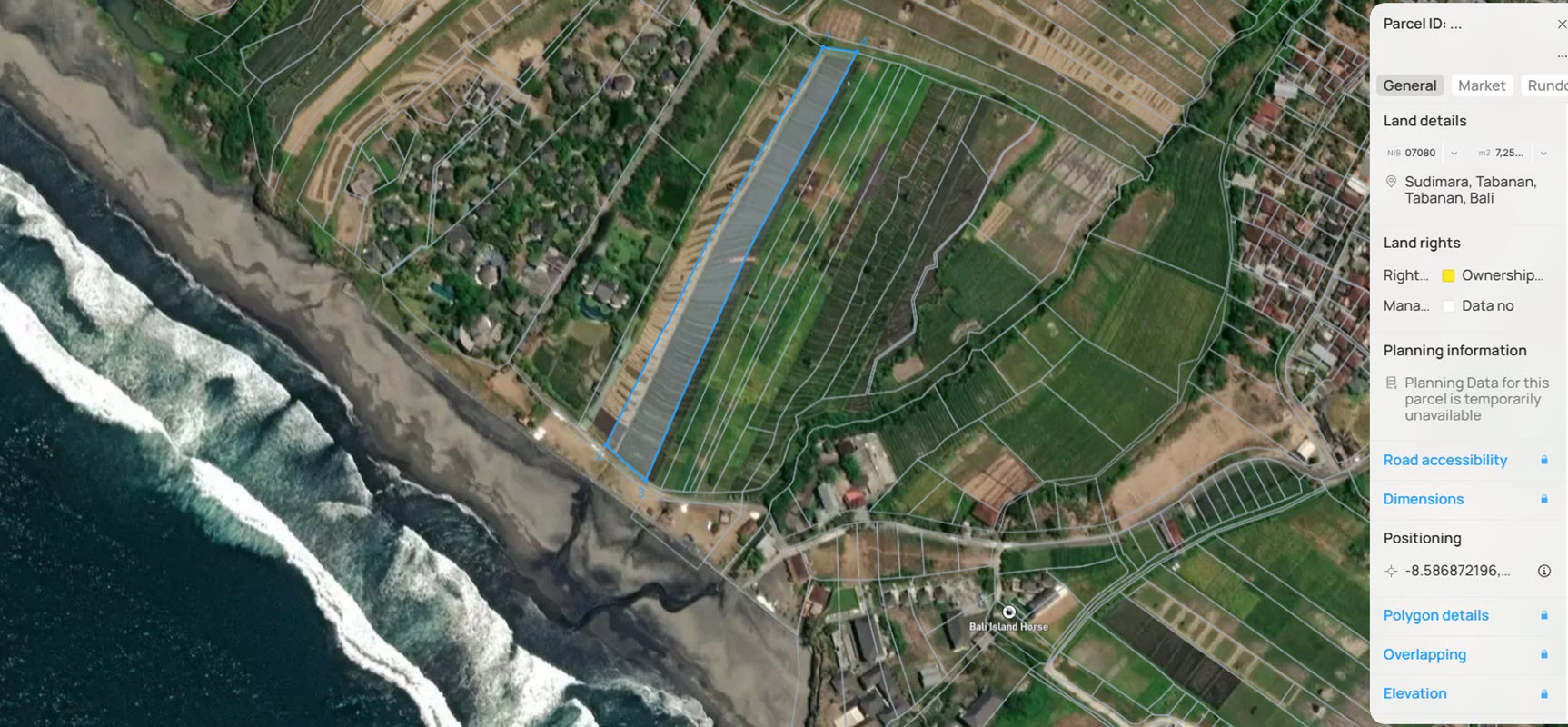 Positioned between two well-known destinations of WakaGangga and Cliffhanger Bali Restaurant, this 72.5 ARE (7,250 m²) freehold parcel sits at the heart of Yeh Gangga’s most coveted coastal enclave. With 32 meters of beachside frontage and a gentle slope that rises inland, the land offers a rare opportunity to capture ocean views across multiple levels of development.